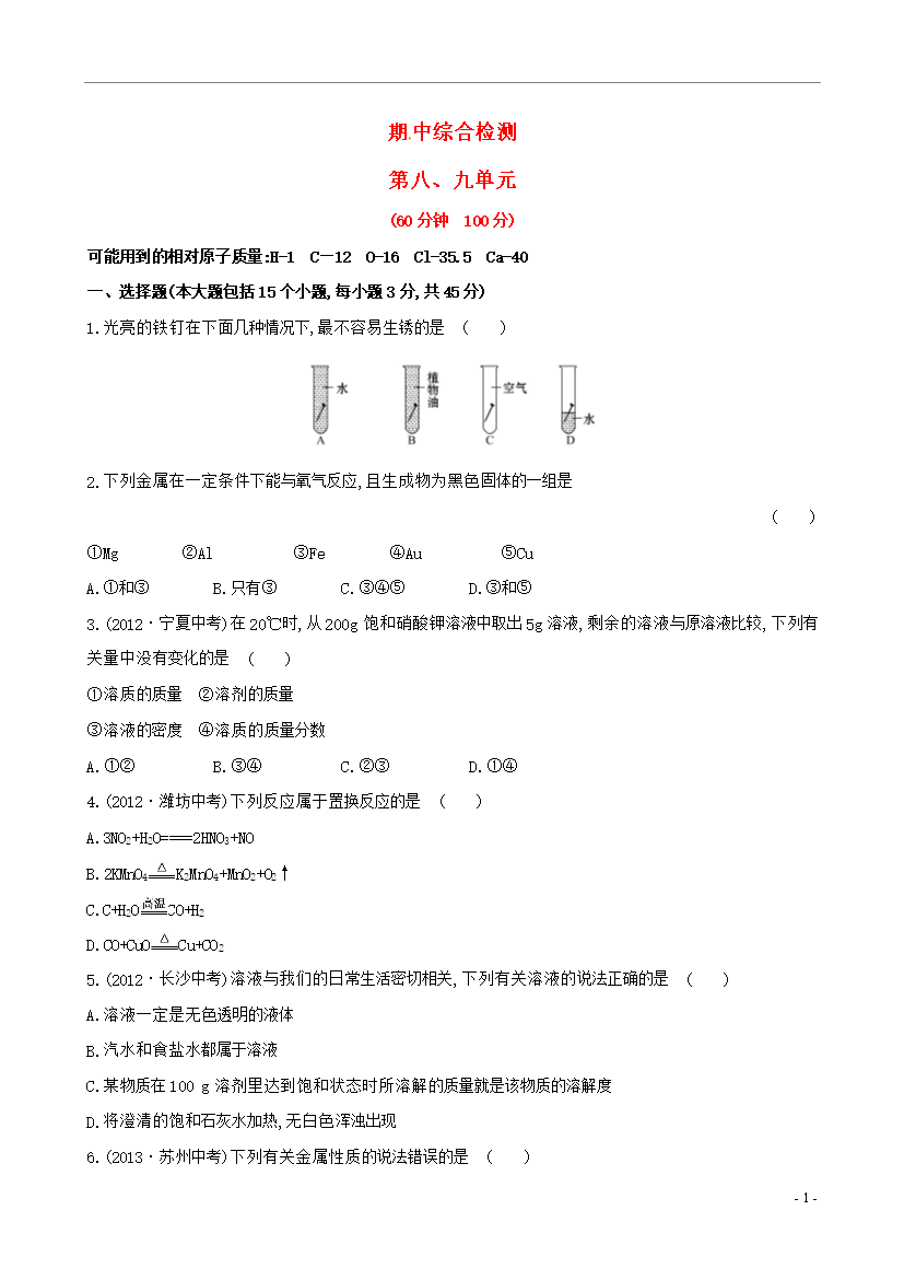 试题-全国-2014_2014新学期中考化学考点细致单元复习 九下 期中综合检测(考点汇聚通用,含2013试题及详细解析+名师押题) 新人教版