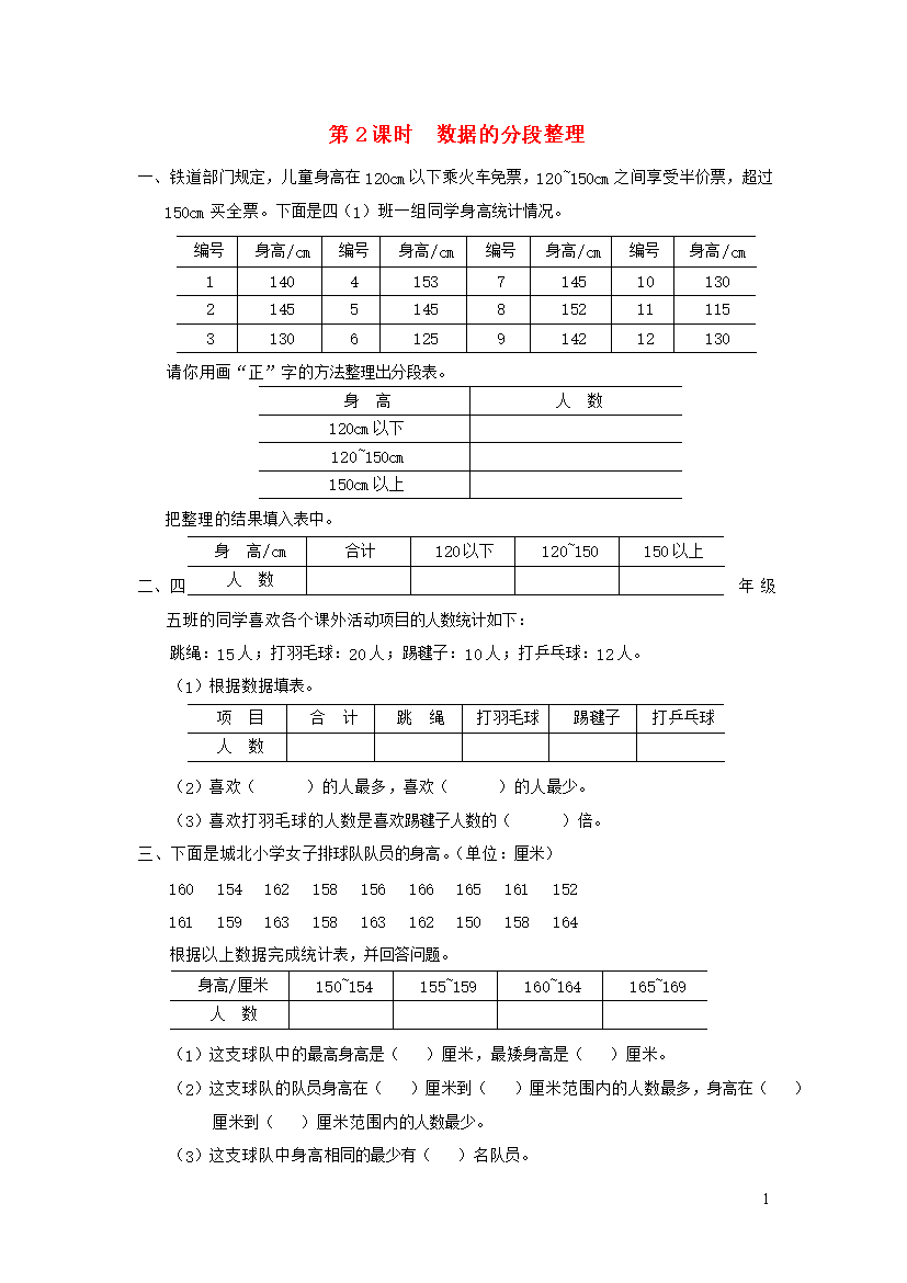 试题-全国-2019_四年级数学上册 第四单元 统计表和条形统计图(一)第2课时 数据的分段整理课堂作业设计 苏教版
