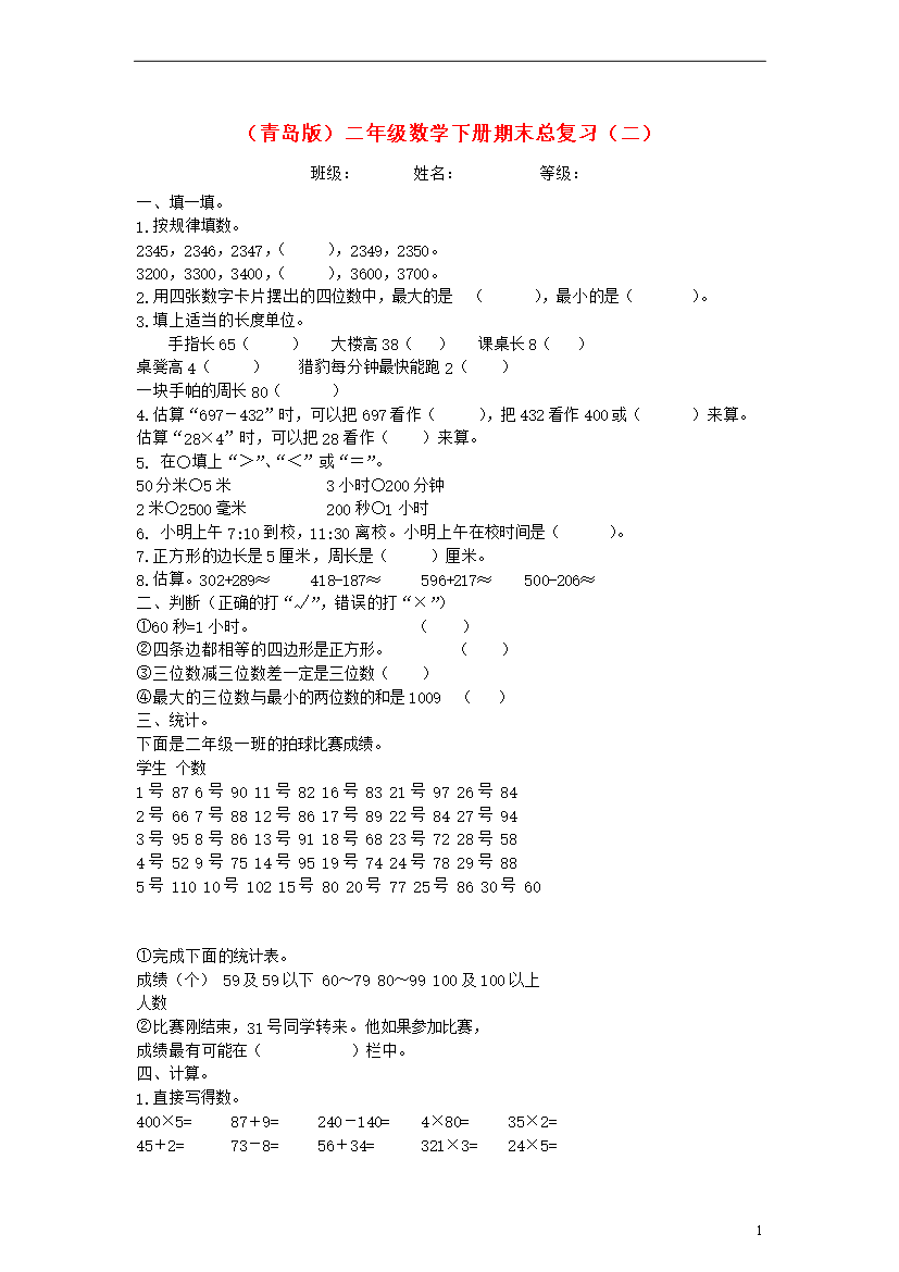 试题-全国-2013_二年级数学下册 期末总复习(二)(无答案)青岛版