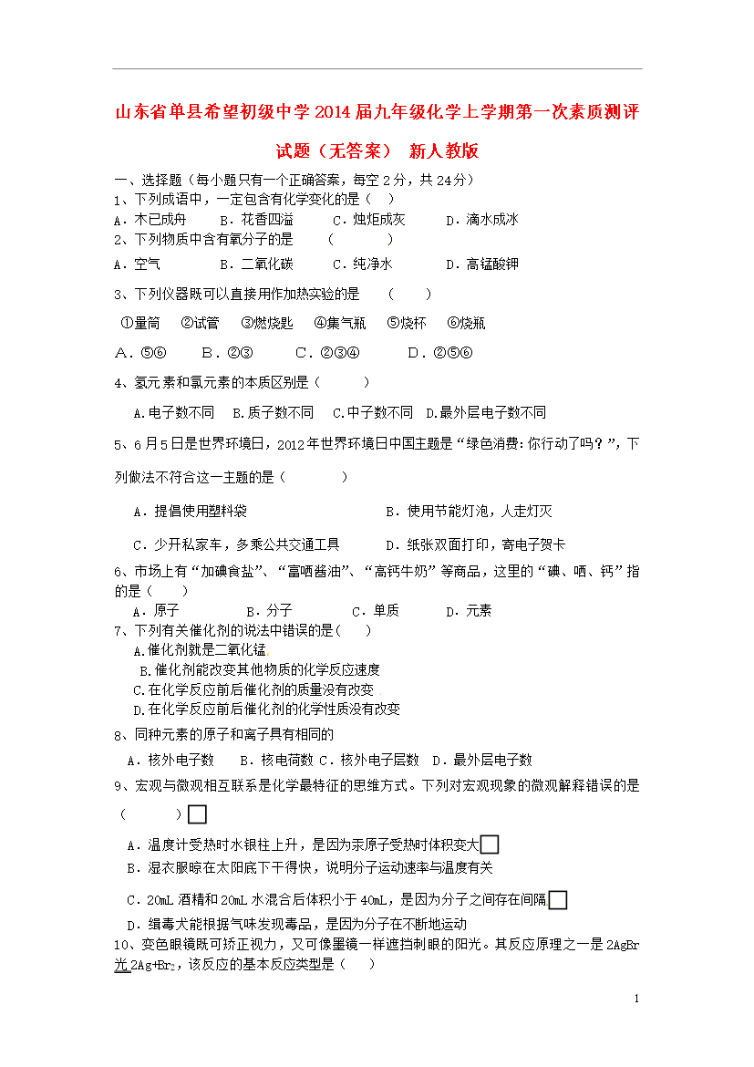 试题-山东-2013_山东省单县希望初级中学2014届九年级化学上学期第一次素质测评试题(无答案) 新人教版