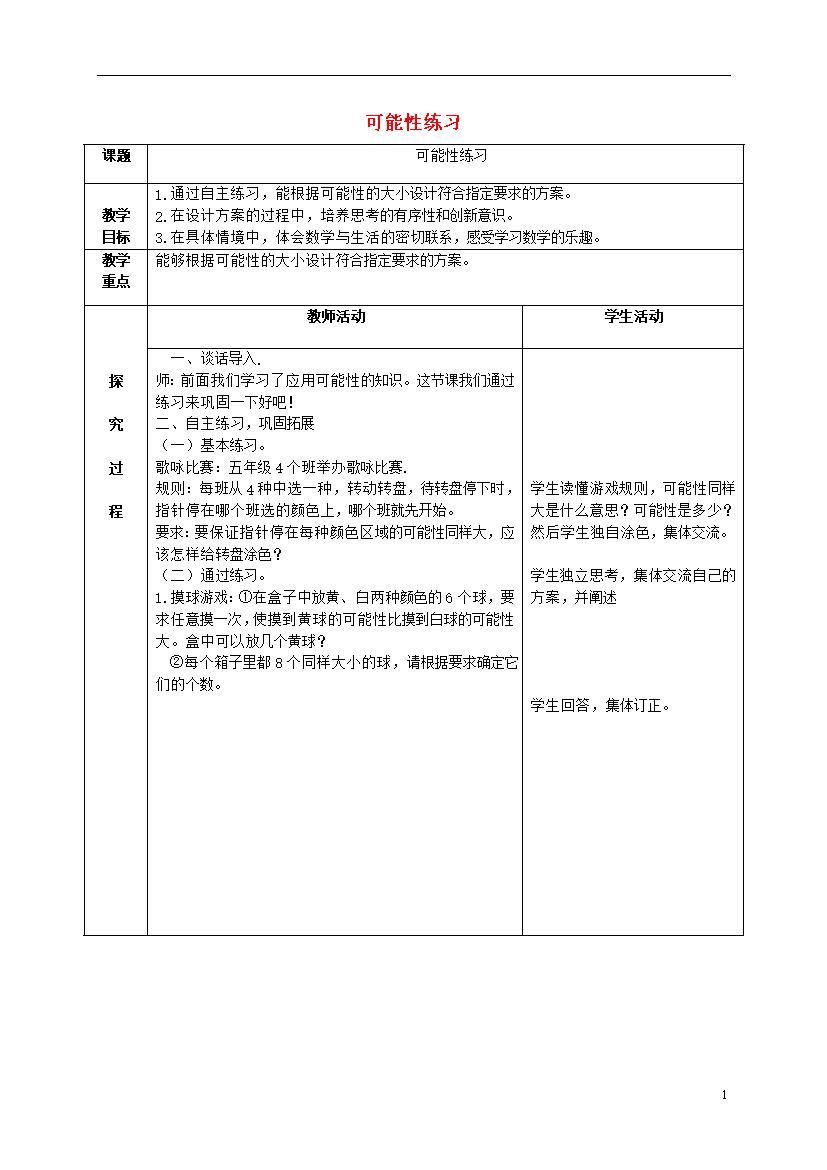 教案-全国-2011_五年级数学上册 可能性练习教案 青岛版五年制