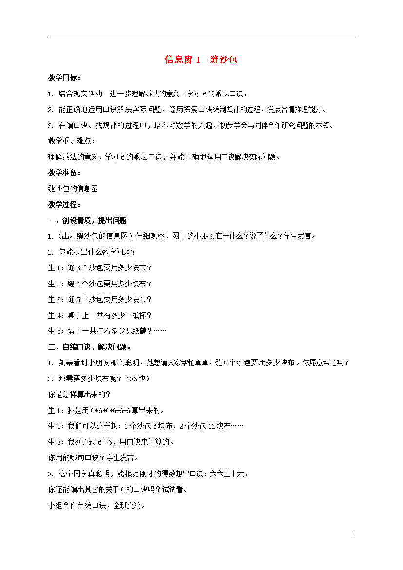 教案-全国-2011_二年级数学上册 信息窗1 缝沙包教案 青岛版五年制
