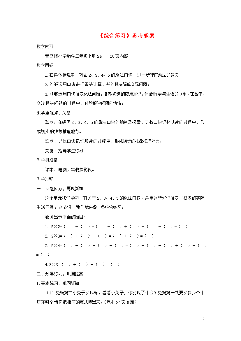 教案-全国-2020_二年级数学上册 二 看杂技 表内乘法(一)《综合练习》参考教案 青岛版六三制
