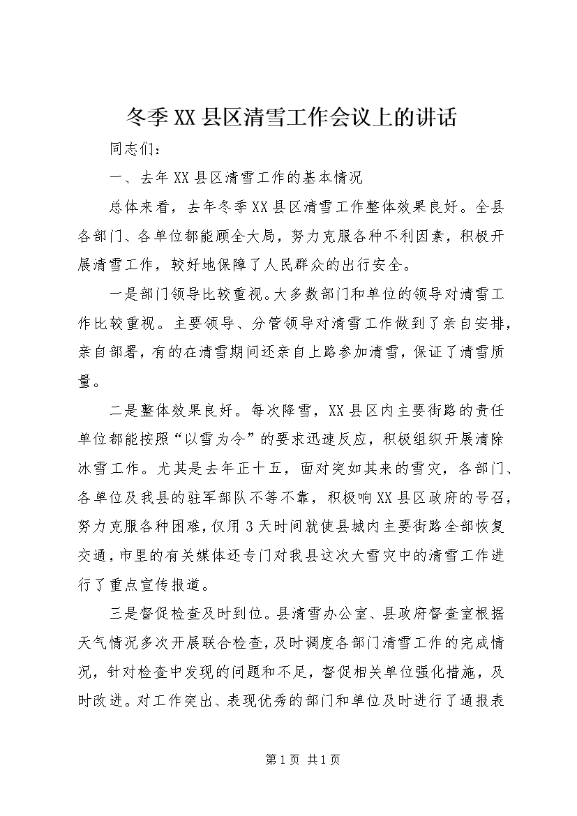 冬季XX县区清雪工作会议上的讲话