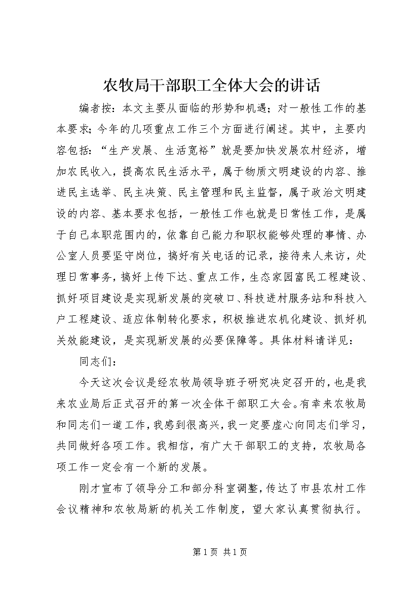 农牧局干部职工全体大会的讲话