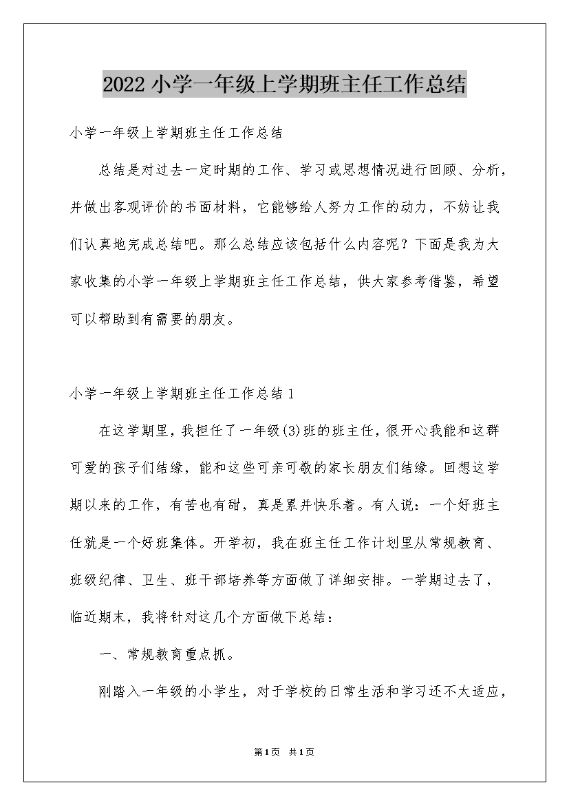 2022小学一年级上学期班主任工作总结