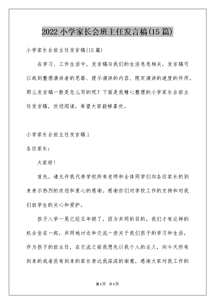 2022小学家长会班主任发言稿(15篇)
