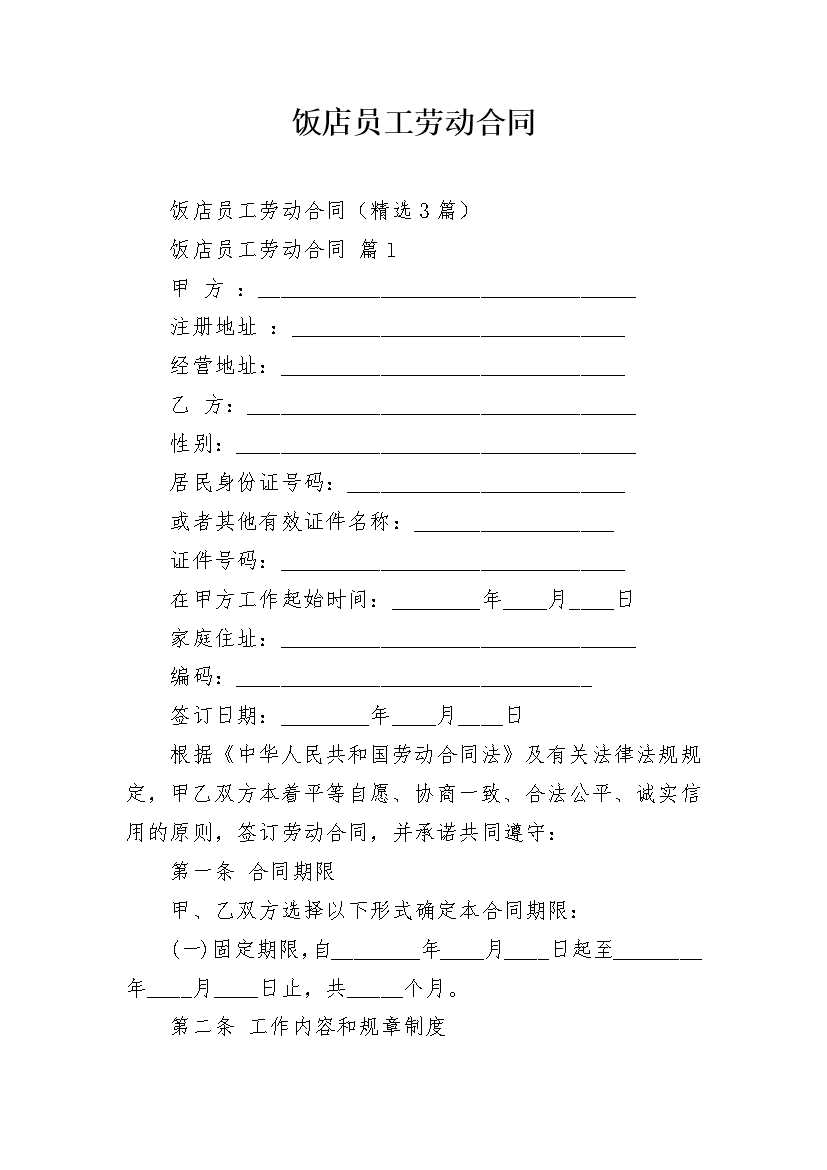 饭店员工劳动合同