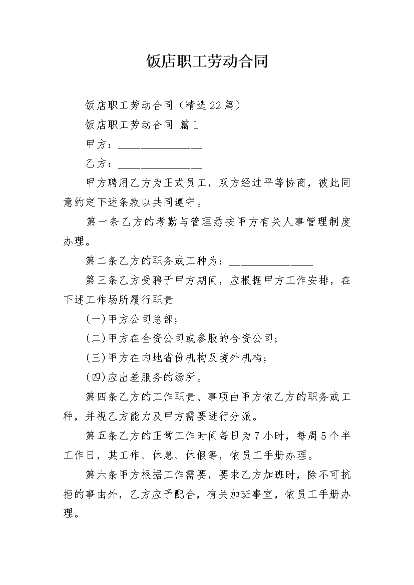 饭店职工劳动合同
