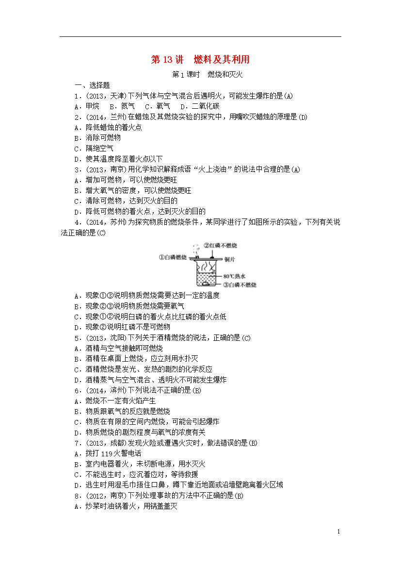 试题-陕西-2014_陕西省2015中考化学总复习 第一轮课时训练 第13讲 燃料及其利用