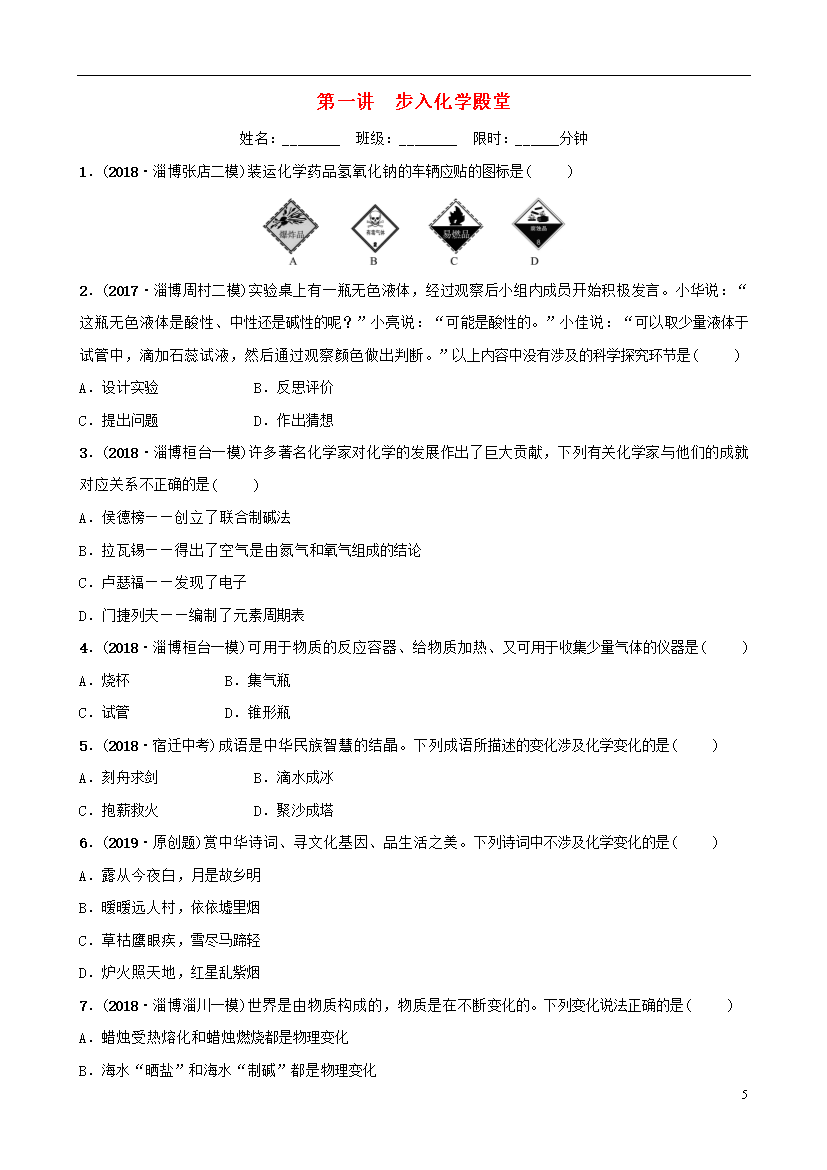 试题-全国-2018_(淄博专版)2019届中考化学复习 第1部分 第一讲 步入化学殿堂练习