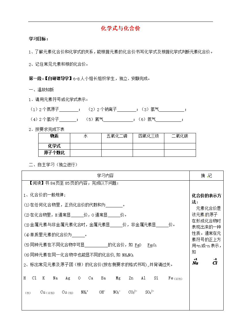 学案-广东-2015_广东省河源中国教育学会中英文实验学校2016届九年级化学上册 第4单元 课题4《化学式与化合价》讲学稿1(无答案)(新版)新人教版