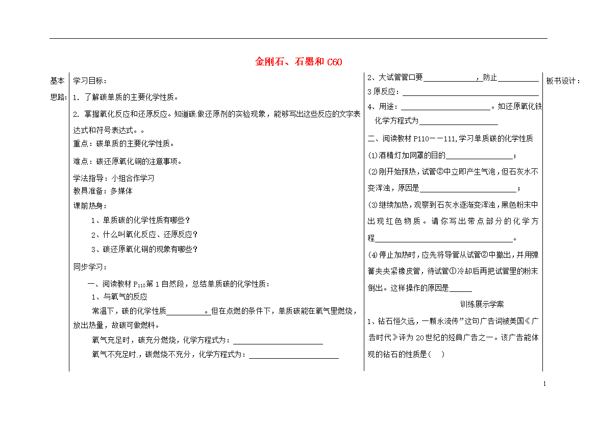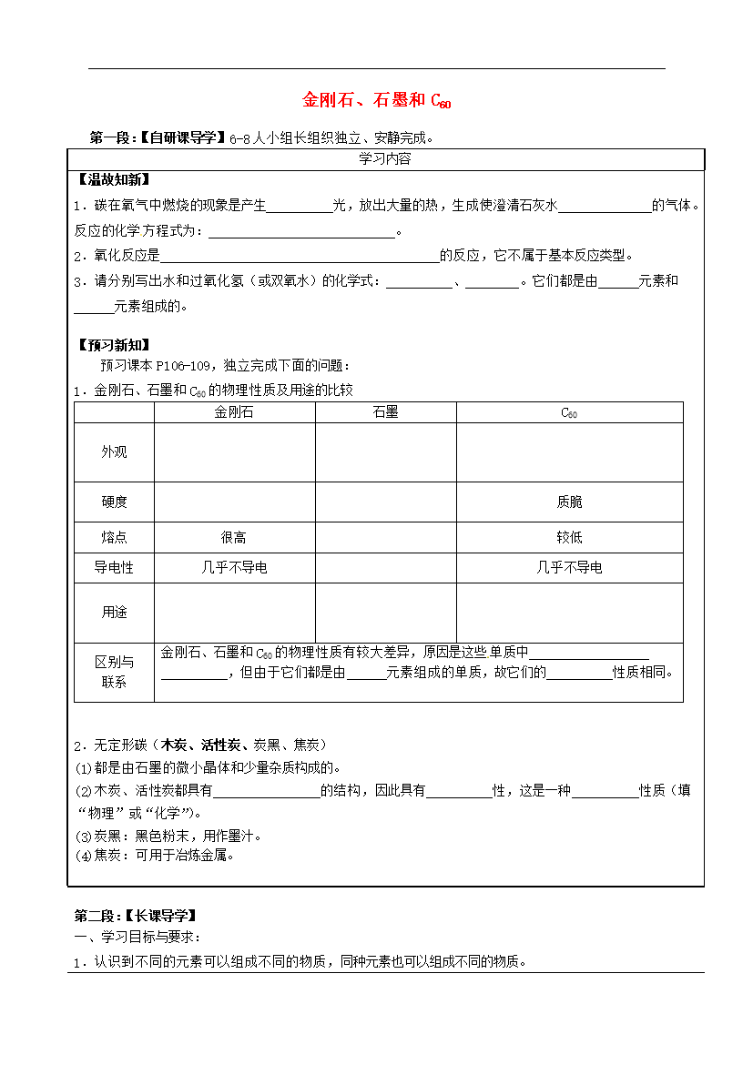 学案-广东-2015_广东省河源中国教育学会中英文实验学校2016届九年级化学上册 第6单元 课题1《金刚石、石墨和C60》讲学稿(无答案)(新版)新人教版