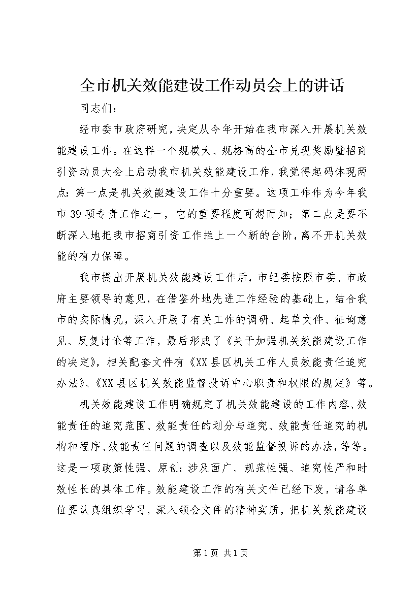 全市机关效能建设工作动员会上的讲话
