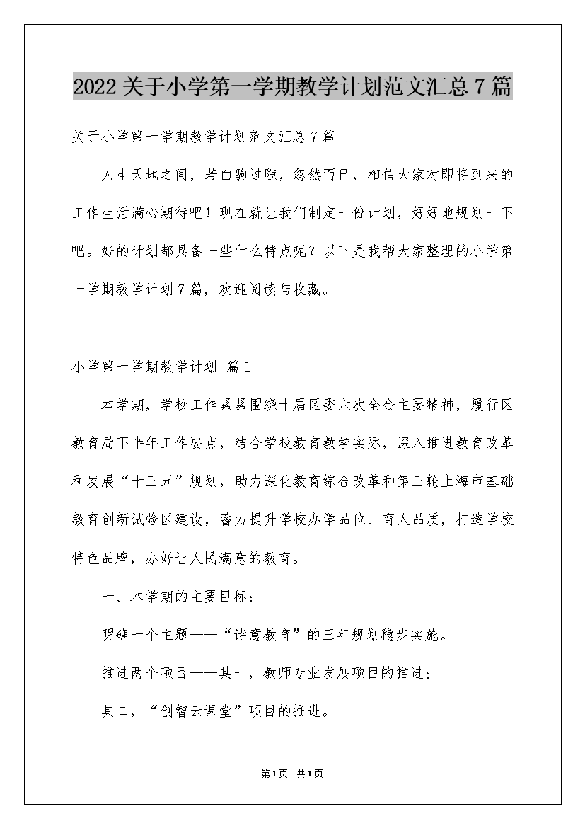2022关于小学第一学期教学计划范文汇总7篇