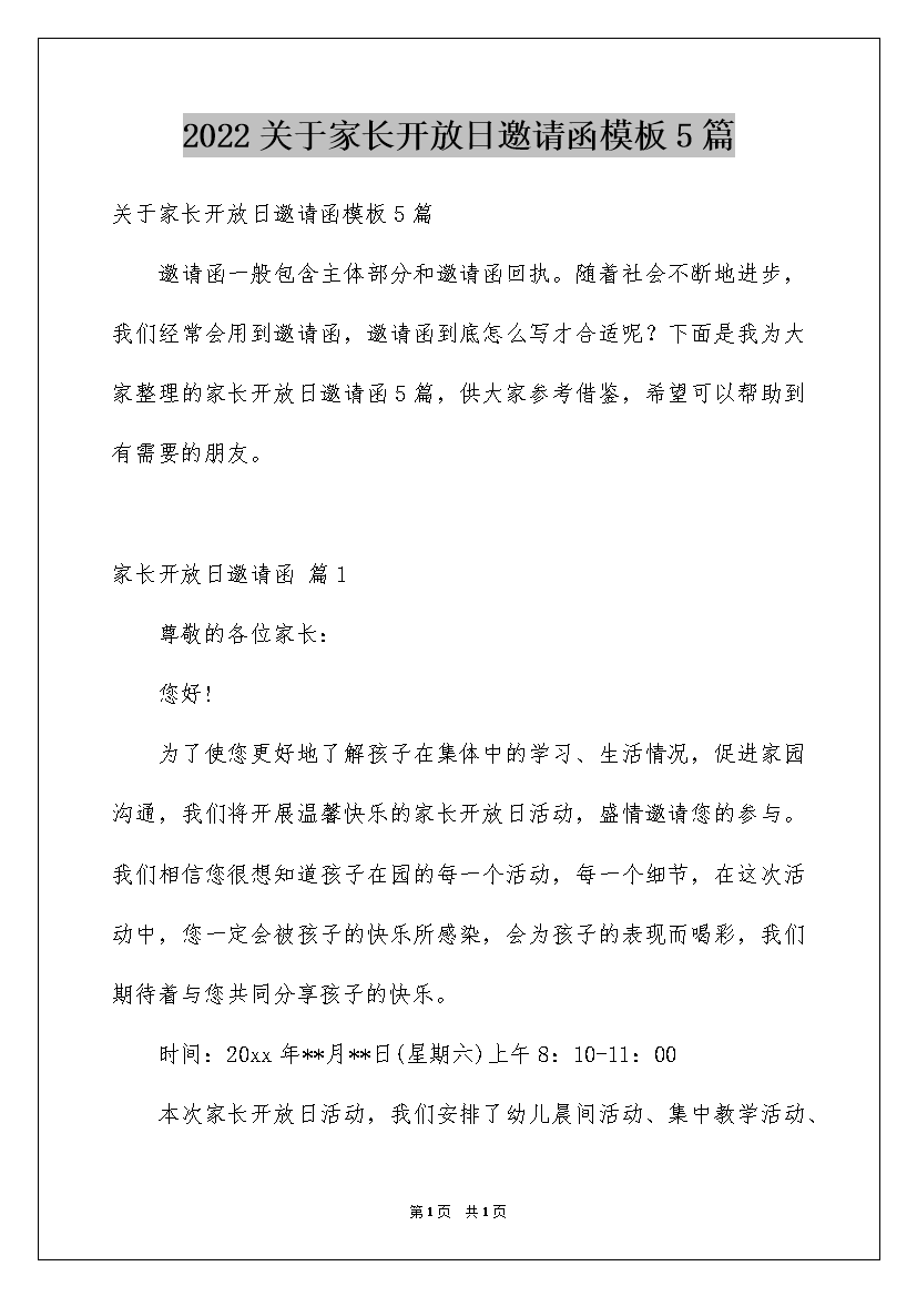 2022关于家长开放日邀请函模板5篇