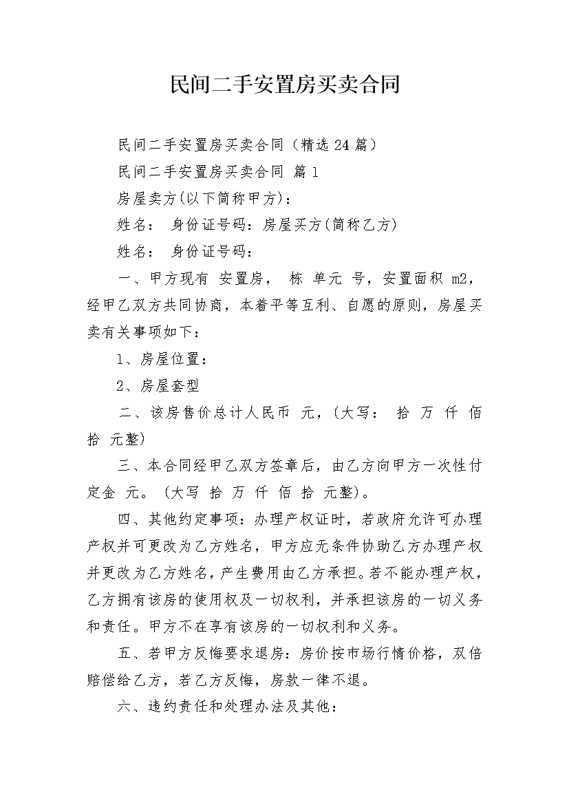 民间二手安置房买卖合同