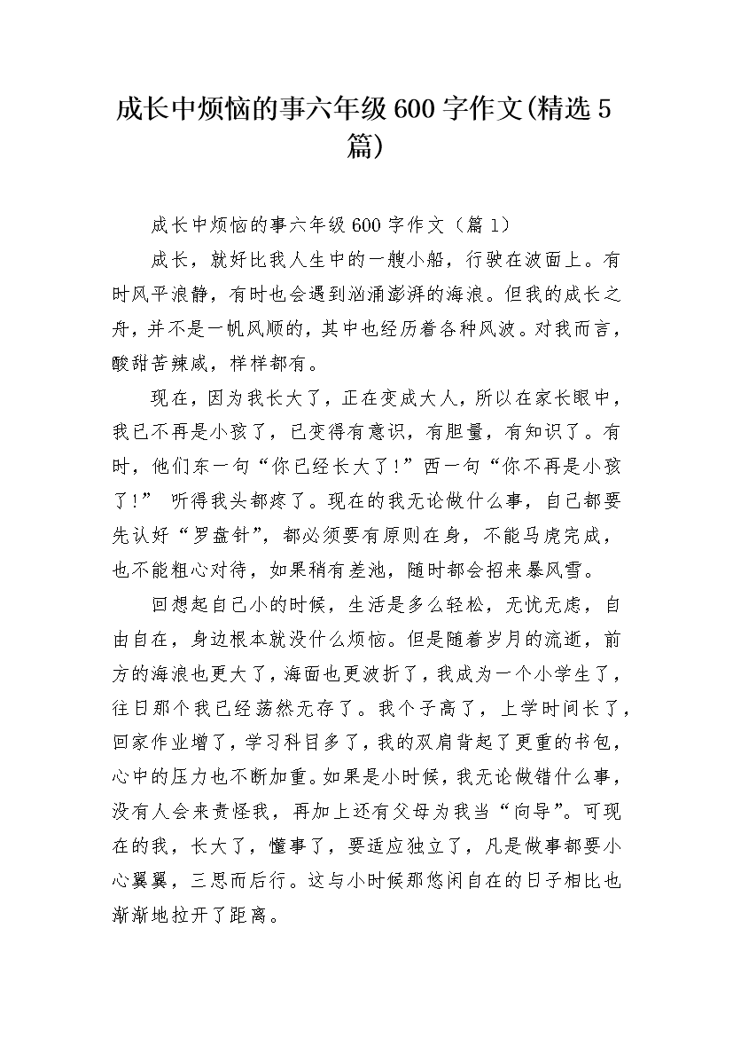 成长中烦恼的事六年级600字作文(精选5篇)