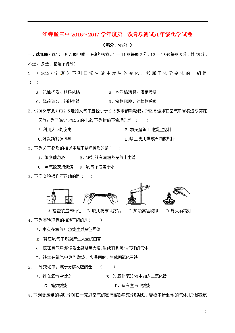 试题-宁夏-2017_宁夏红寺堡区第三中学2017届九年级化学上学期第一次专项测试试题(无答案)