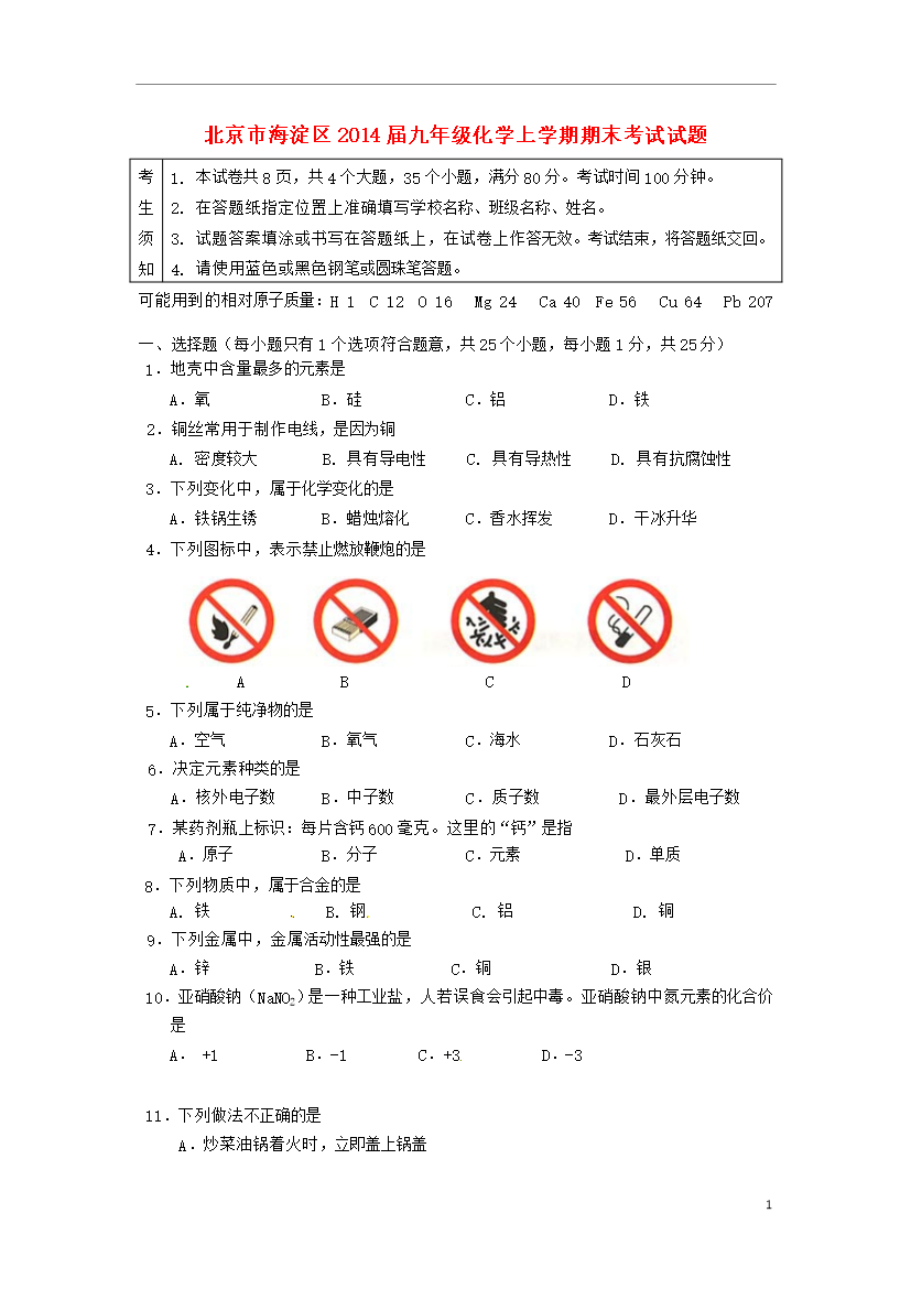 试题-北京-2014_北京市海淀区2014届九年级化学上学期期末考试试题