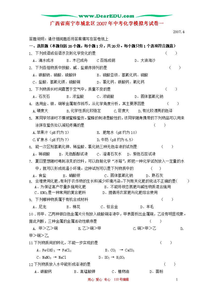 试题-广西-2007_广西南宁市城北区2007年中考化学模拟考试卷一