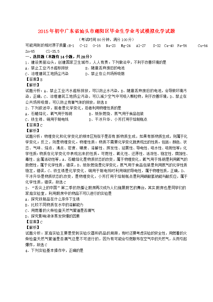 试题-广东-2015_广东省汕头市潮南区2015届九年级化学学业考试试题(含解析)