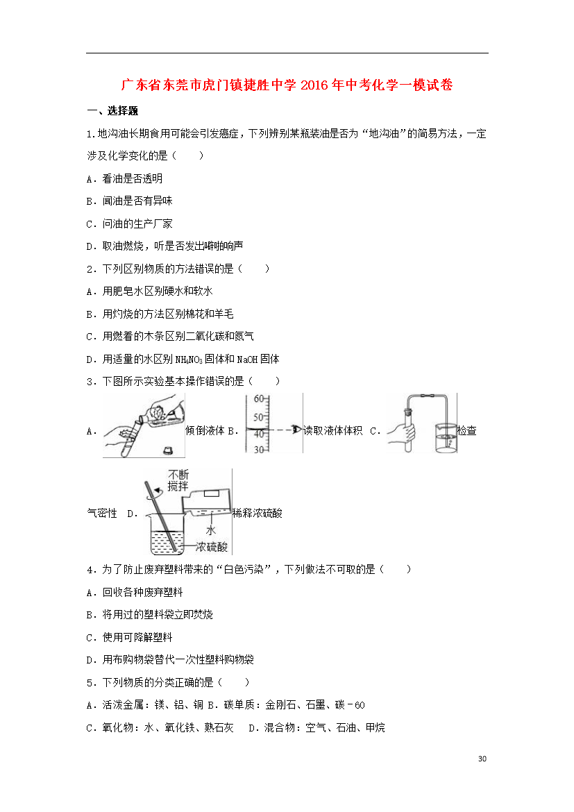 试题-广东-2016_广东省东莞市虎门镇捷胜中学2016年中考化学一模试卷(含解析)