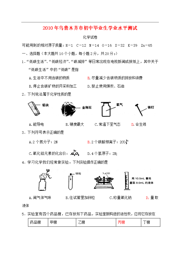 试题-新疆-2010_新疆乌鲁木齐市2010年中考真题化学试题