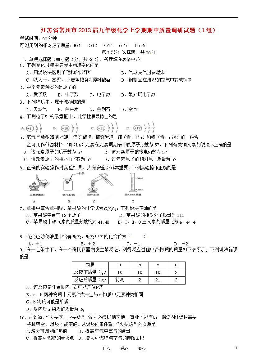 试题-江苏-2012_江苏省常州市2013届九年级化学上学期期中质量调研试题(1组)