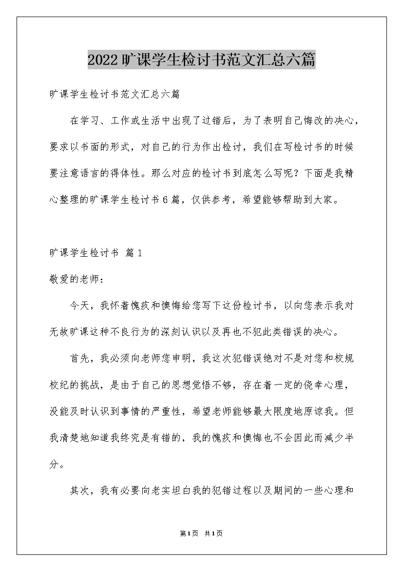 2022旷课学生检讨书范文汇总六篇