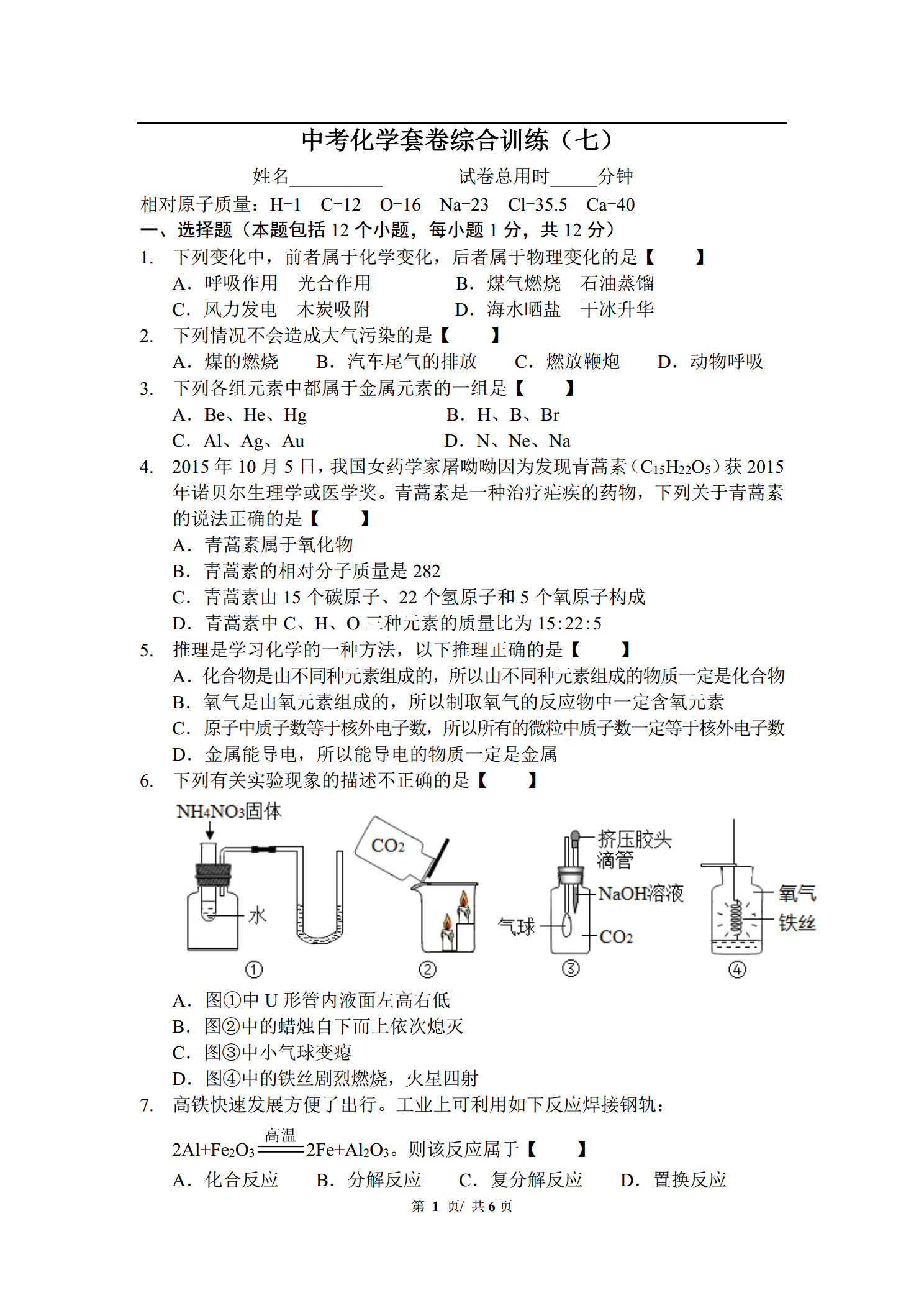试题-河南-2016_河南省信阳市新县一中2016届中考化学套卷训练(七)(pdf)