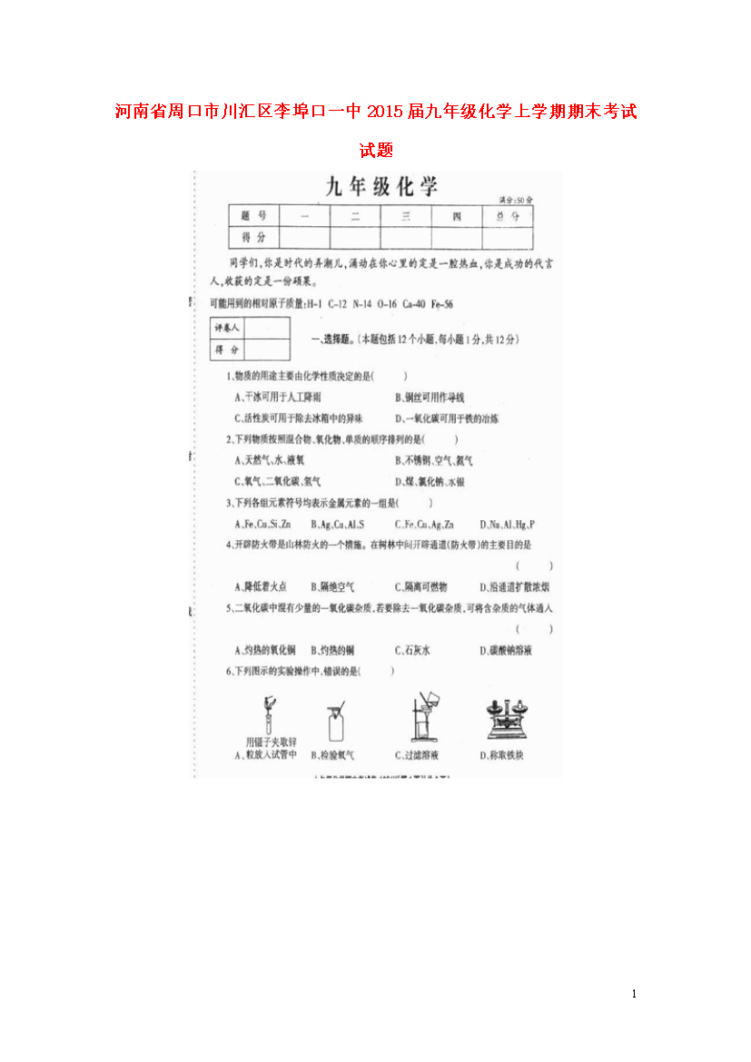 试题-河南-2015_河南省周口市川汇区李埠口一中2015届九年级化学上学期期末考试试题(扫描版)