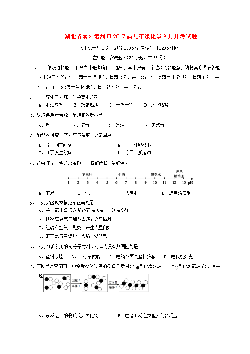 试题-湖北-2017_湖北省襄阳老河口2017届九年级化学3月月考试题