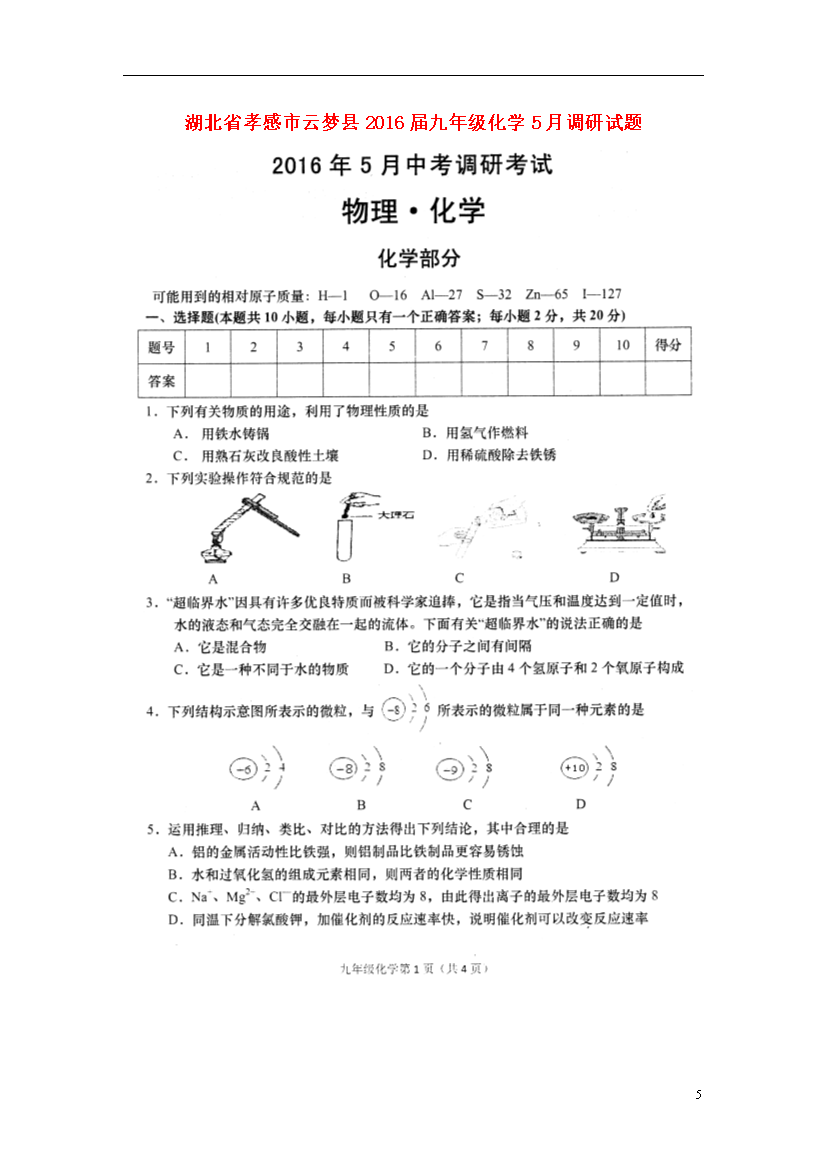 试题-湖北-2016_湖北省孝感市云梦县2016届九年级化学5月调研试题(扫描版)