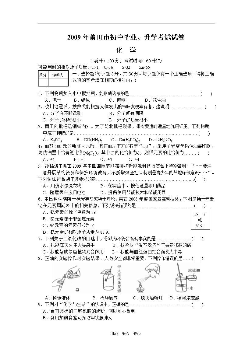 试题-福建-2009_2009年福建省莆田市中考化学试题(Word版有答案)