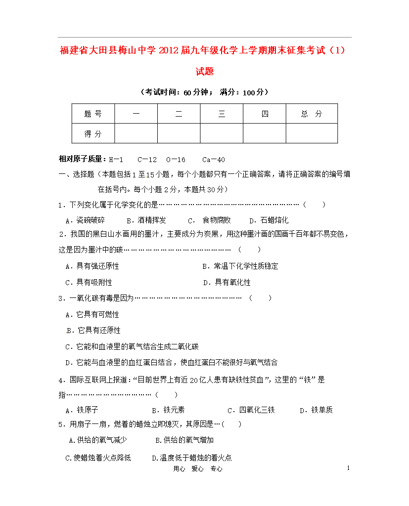 试题-福建-2011_福建省大田县梅山中学2012届九年级化学上学期期末征集考试(1)试题