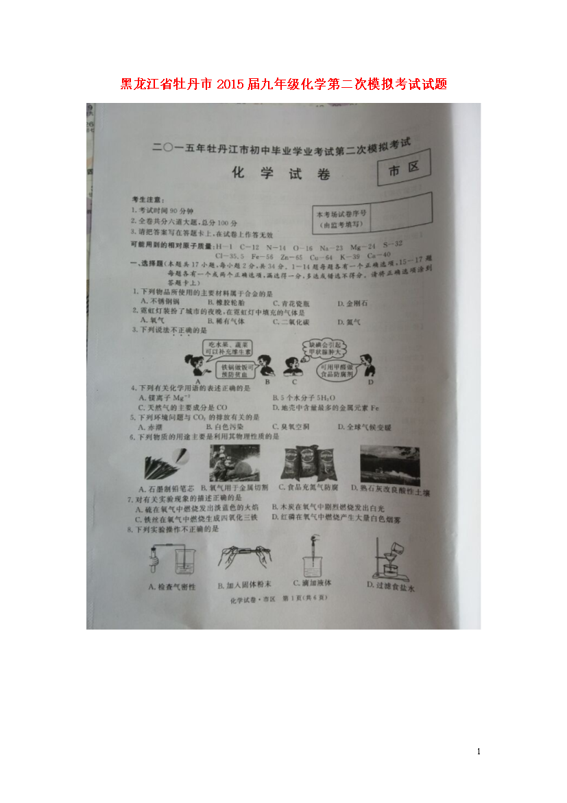 试题-黑龙江-2015_黑龙江省牡丹市2015届九年级化学第二次模拟考试试题(扫描版)
