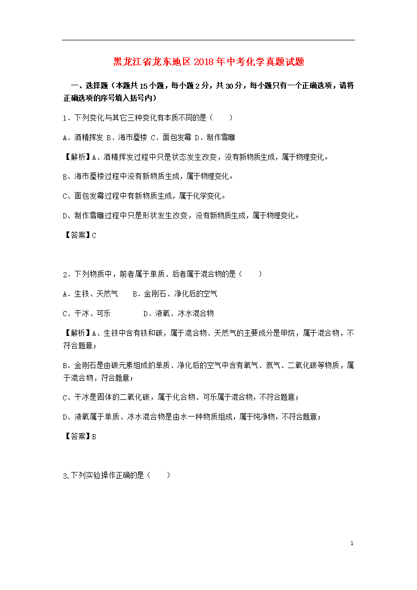 试题-黑龙江-2018_黑龙江省龙东地区2018年中考化学真题试题(含解析)