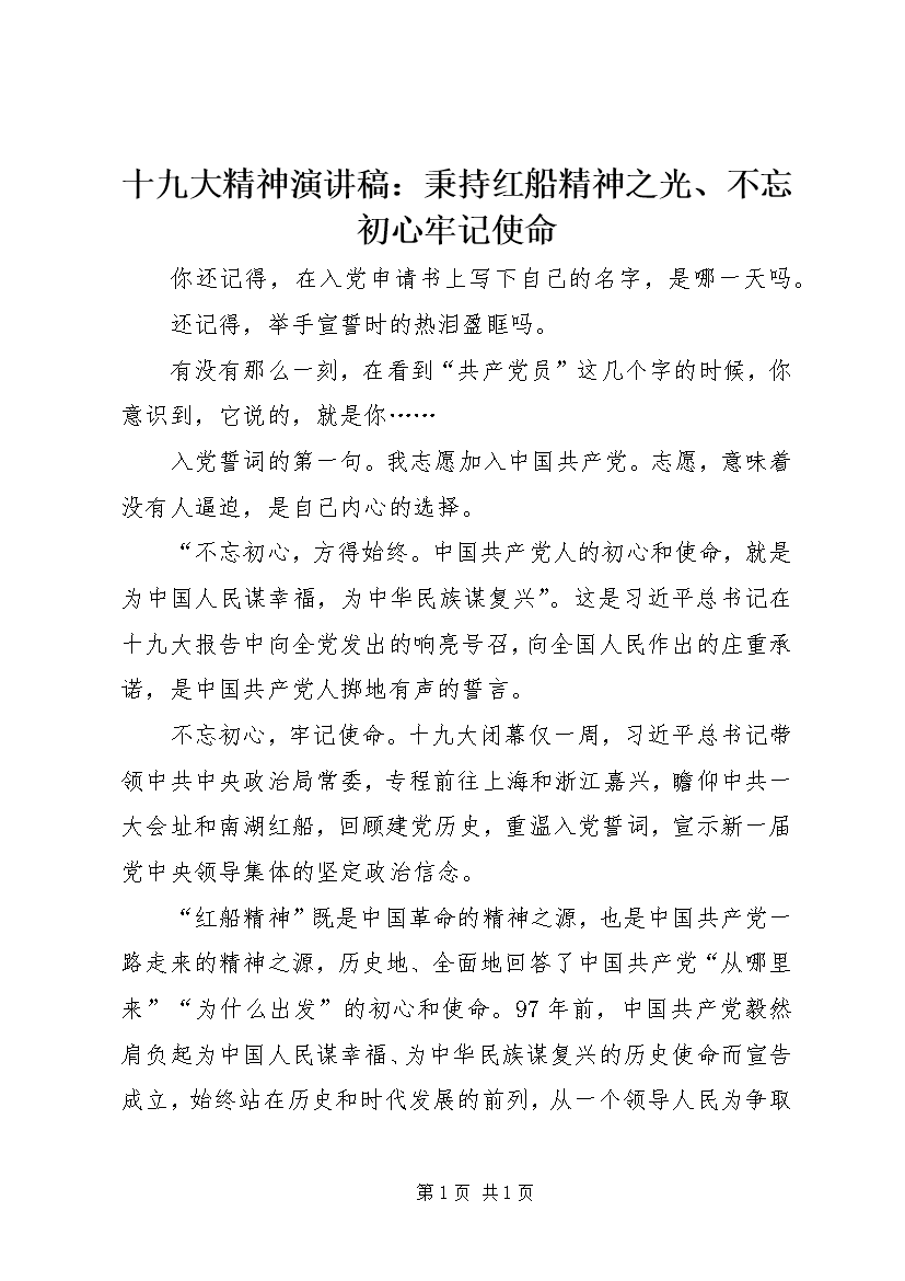 十九大精神演讲稿:秉持红船精神之光、不忘初心牢记使命