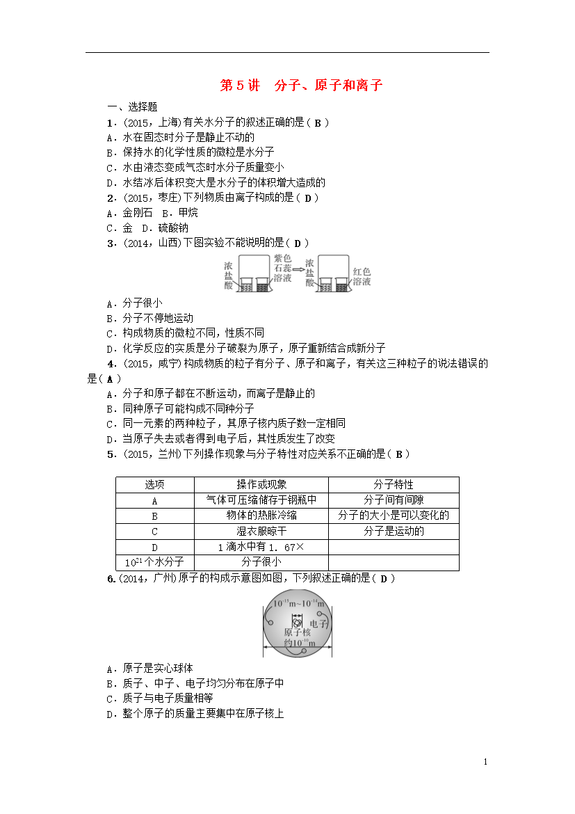 试题-全国-2016_(全国版)2016中考化学 考点跟踪突破 第5讲 分子、原子和离子