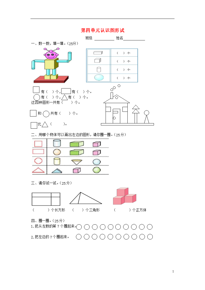 试题-全国-2017_2017秋一年级数学上册 第四单元 认识图形一单元试卷1(无答案)新人教版