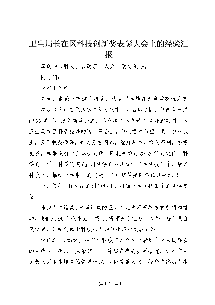 卫生局长在区科技创新奖表彰大会上的经验汇报