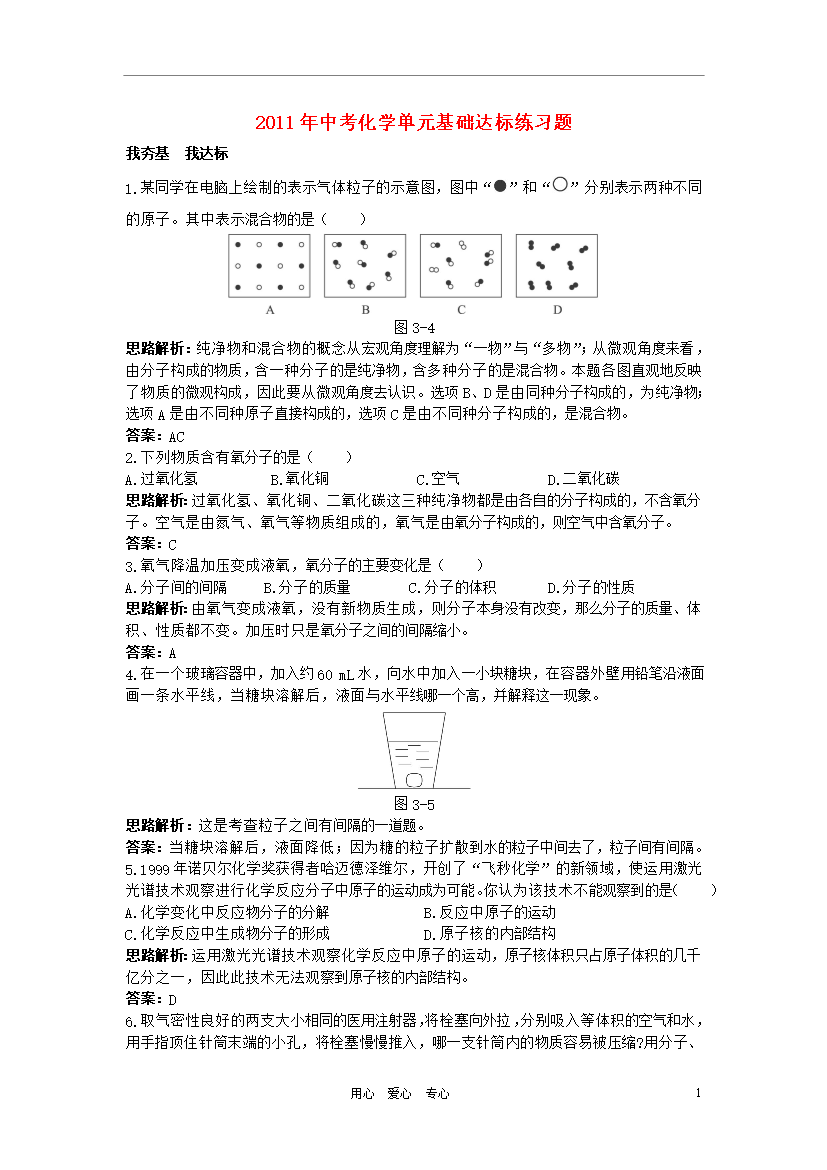 试题-全国-2010_2011年中考化学单元基础达标练习题 第三单元课题2 分子和原子 (含教师版解析)