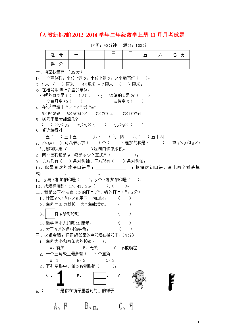 试题-全国-2013_2013-2014学年二年级数学上学期11月月考试题(无答案) 新人教版