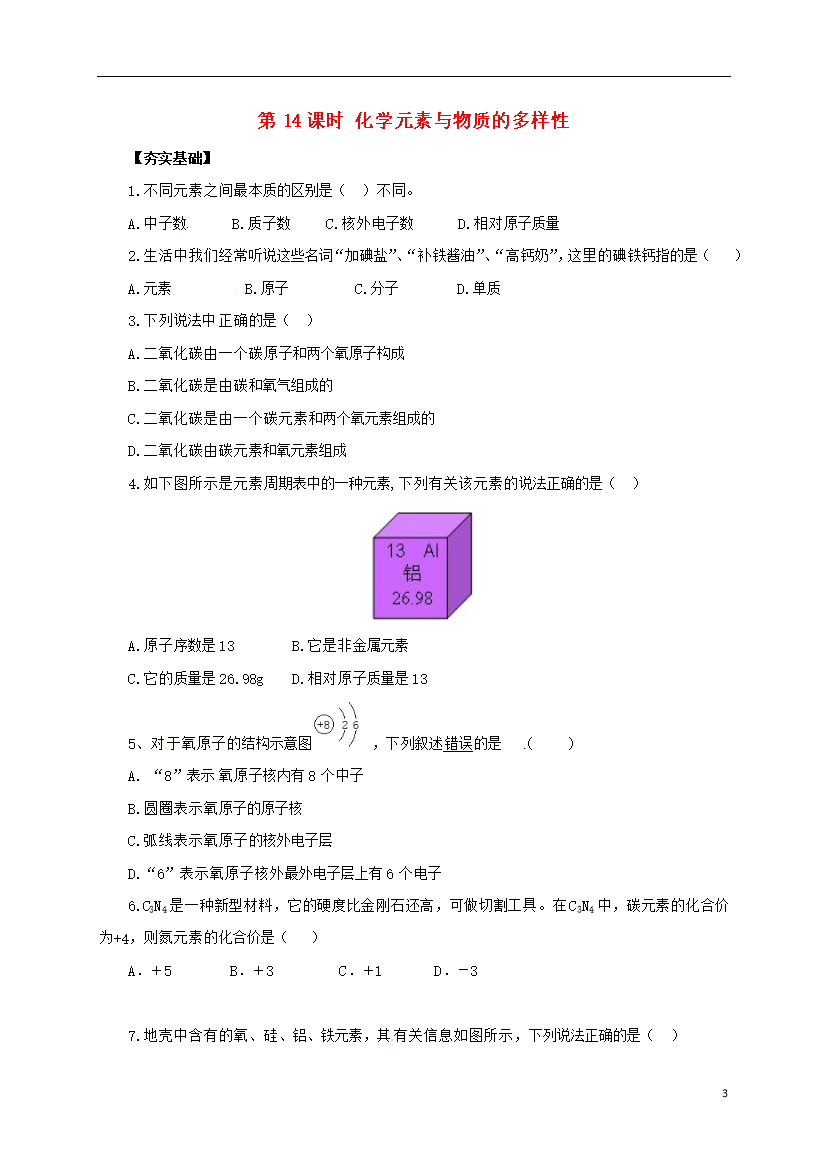 试题-全国-2017_2017届中考化学一轮复习 第14课时 化学元素与物质的多样性对点精练