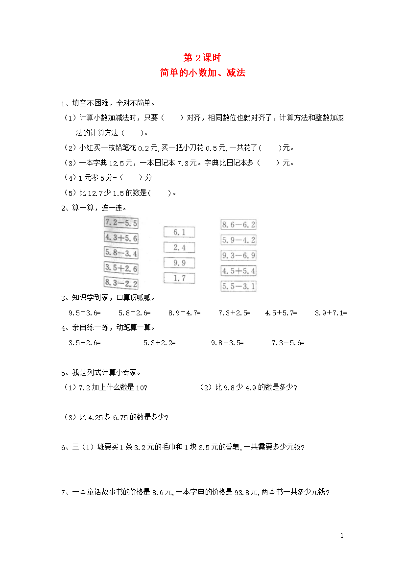 试题-全国-2019_三年级数学下册 第七单元 小数的初步认识 第2课时 简单的小数加、减法一课一练(无答案) 新人教版