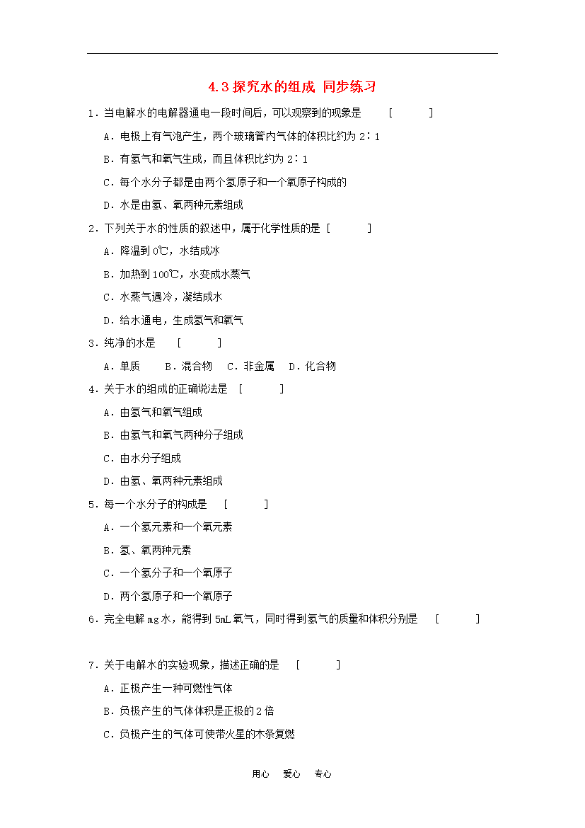 试题-全国-2009_九年级化学上:第四章第三节探究水的组成同步练习(无答案)科粤版