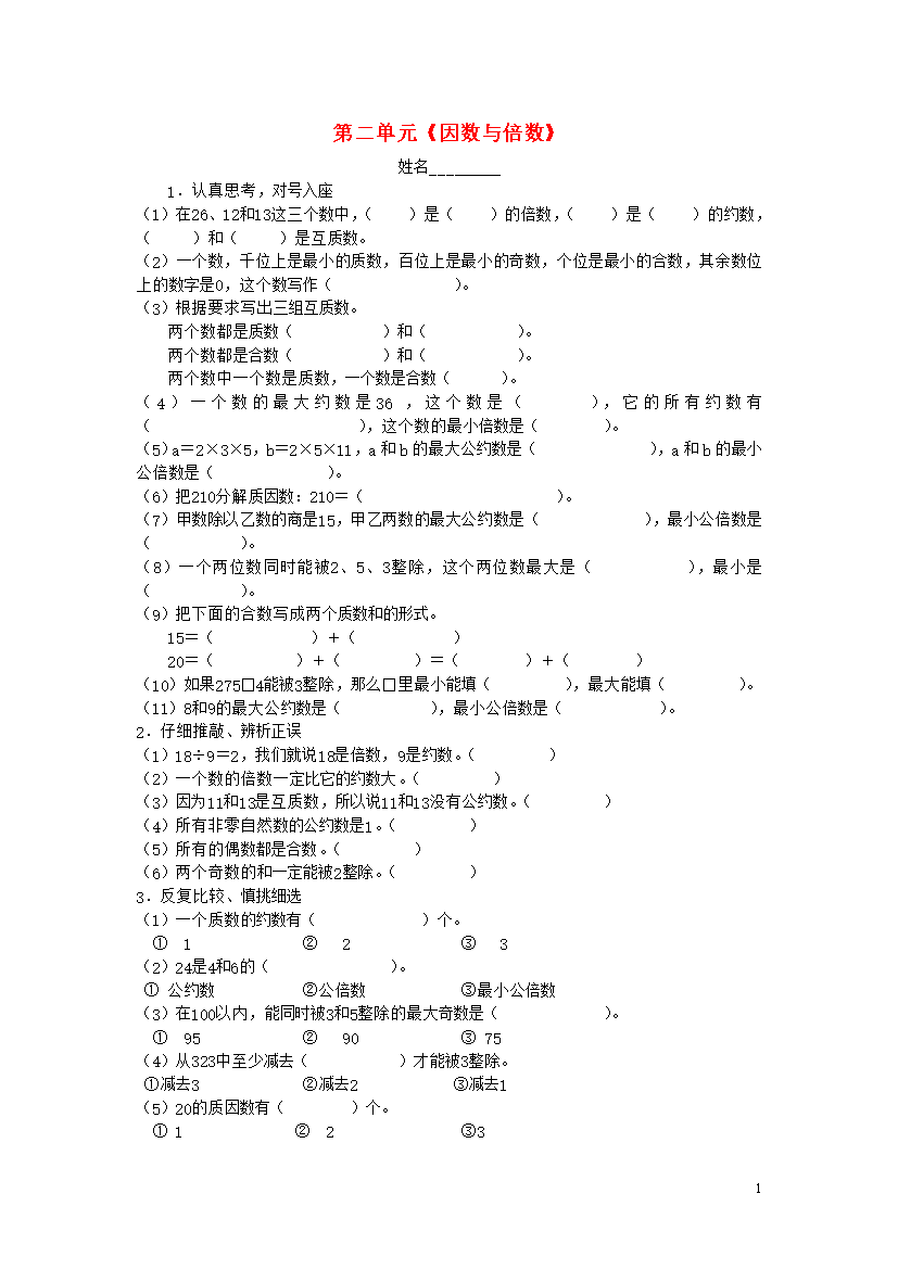 试题-全国-2019_2018学年五年级数学下册 第2单元《因数与倍数》测试卷(3)(无答案) 新人教版