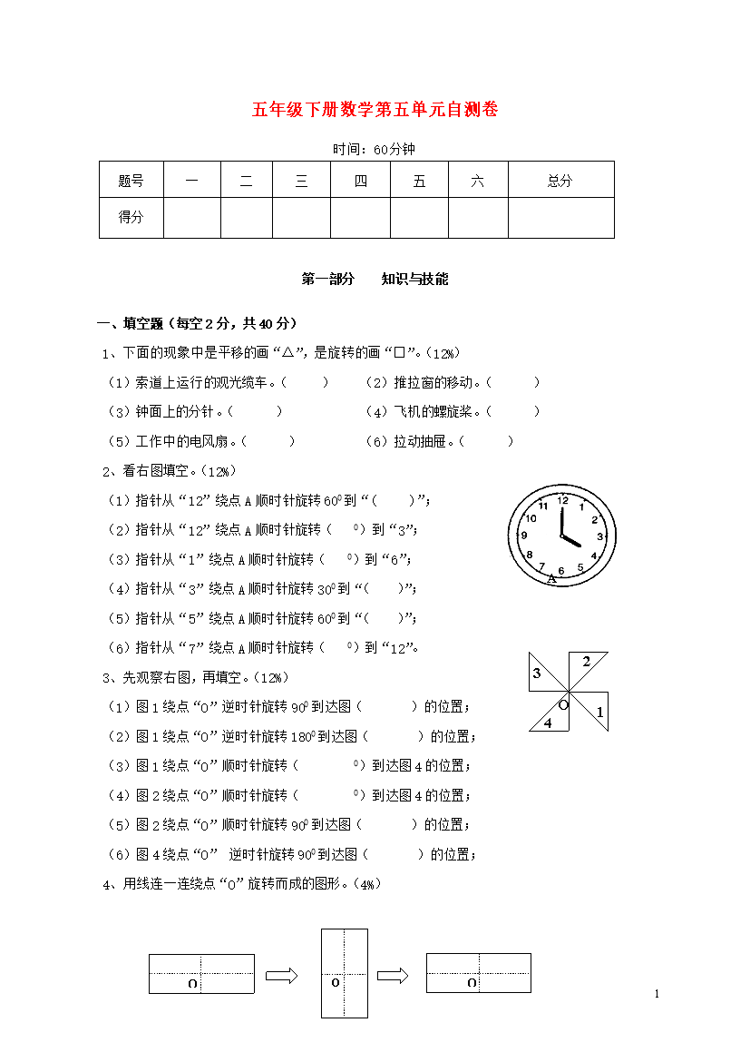试题-全国-2019_2018学年五年级数学下册 第5单元《图形的运动(三)》测试卷(1)(无答案) 新人教版