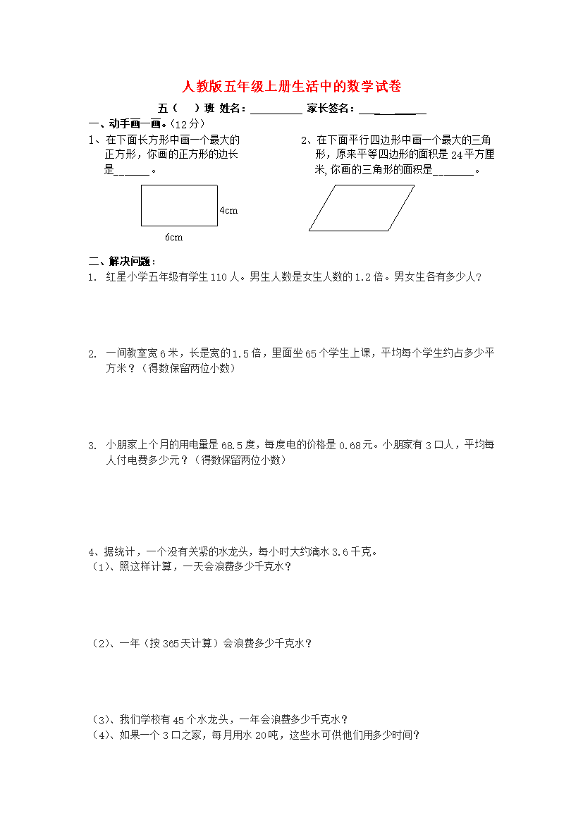 试题-全国-2019_2018学年五年级数学上册 专项练习 生活中的数学试卷(无答案) 新人教版